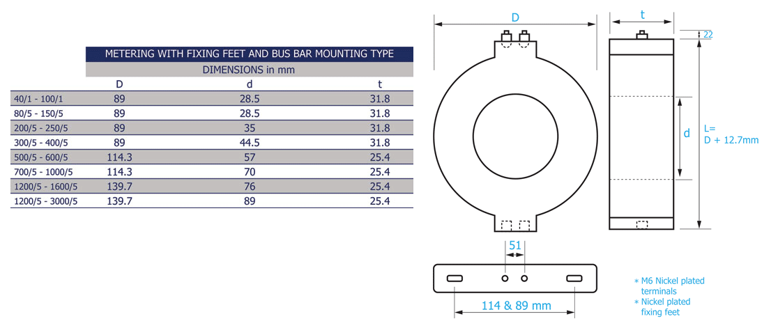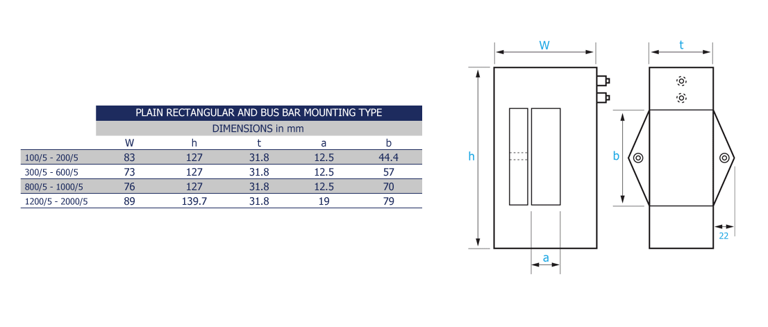 These current transformers are encapsulated in resin. The standard range offers both measuring and protective types with either the rectangular or circular slot sized to fit busbars from 20mm to 250mm and can be manufactured in a variety of ratios from 60A to 6000A.
